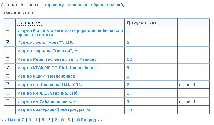 авторам, издательствам, сериям, тезаурусу (рубрикам).